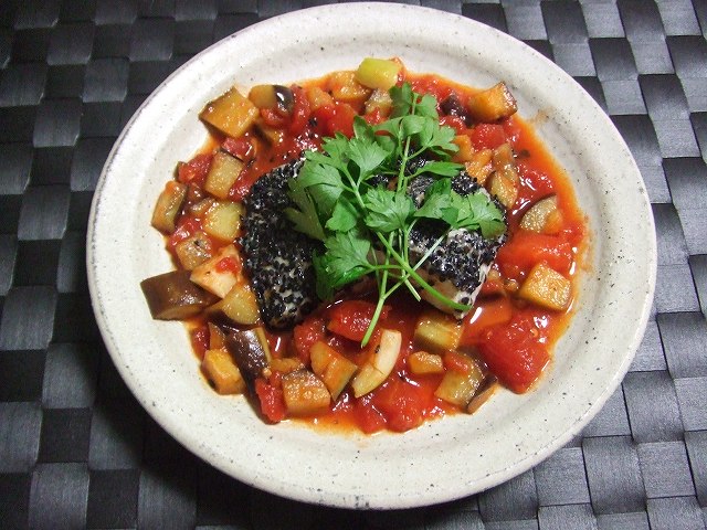 トマトソースや、茄子、黒ゴマの色が