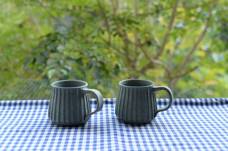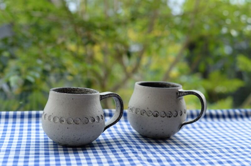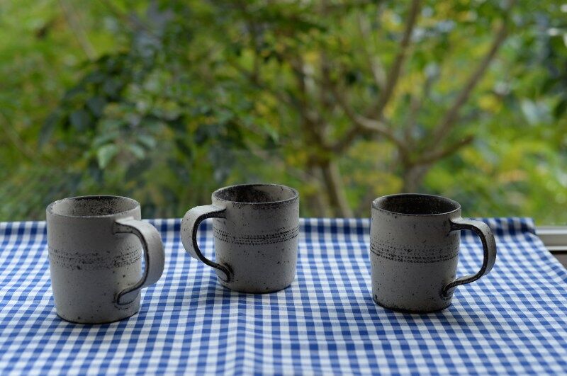 個展では、カップやマグカップを手に
